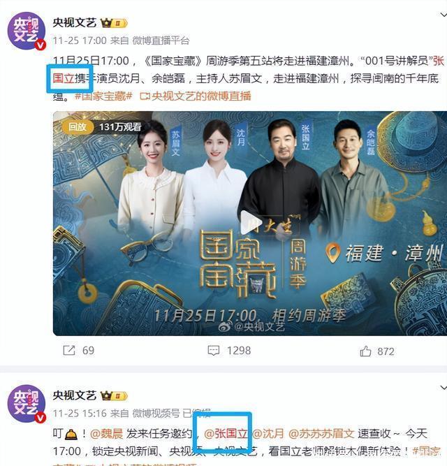 央视四次点名:70岁的张国立,念念退休都难 11月25日那天,央视官方账号不到24小时里,接连发了四条动态@张国立。 底本是他参与的新节目《国度矿藏》要播出了,央视专诚为他宣传。