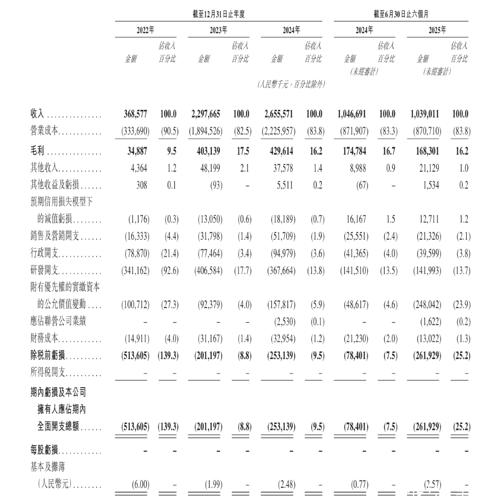 研发投入方面,在2022年、2023年和2024年,车联天下的研发开支分别为人民币3.41亿元、4.07亿元和3.68亿元,分别占收入的92.6%、17.7%、13.8%。2025年上半年,车联天下的研发开支为人民币1.42亿元,占收入的13.7%。