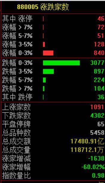 两市共1091只个股上升,46只个股涨停,4302只个股下落。